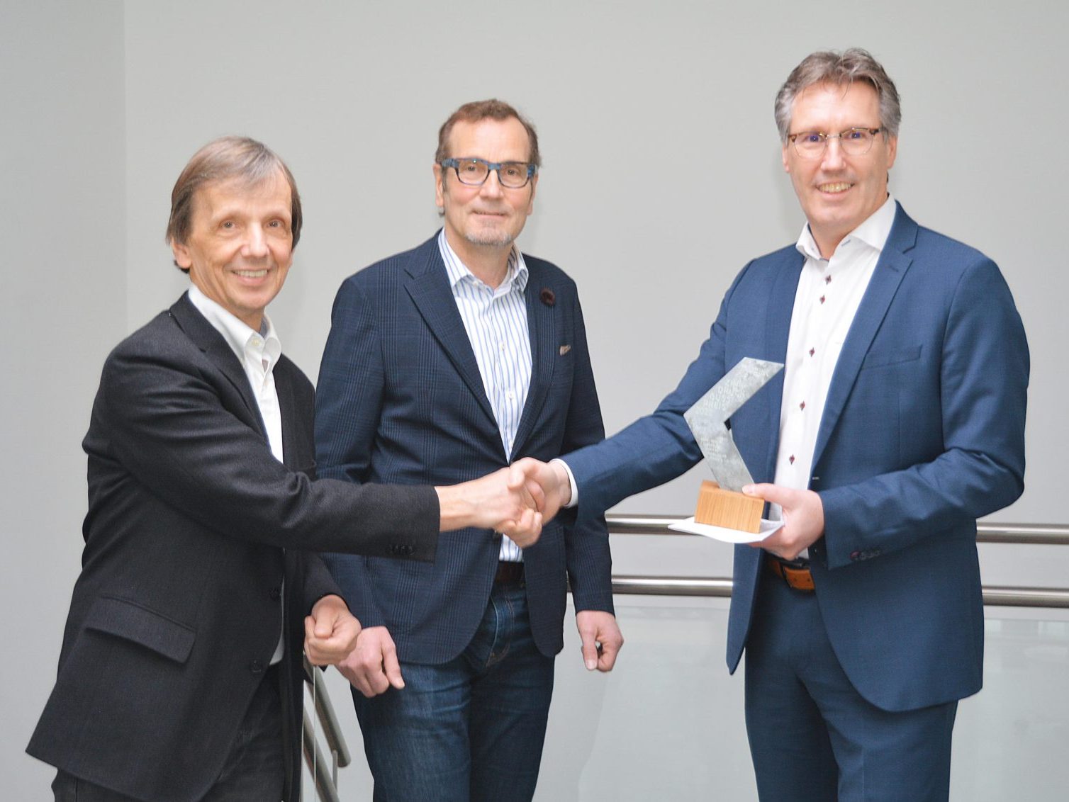Preisverleihung im Hause Dipl.-Ing. Siegfried Müller Druckgiesserei in Velbert (v.l.n.r. Heinz Abel, Frank Hebmüller, Frank Neumann)