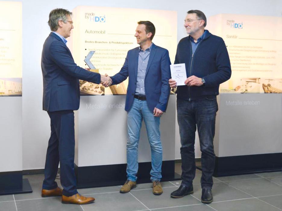 Bildunterschrift: Preisverleihung im Hause der HDO Druckguß- und Oberflächen GmbH in Paderborn (v.l.n.r. Frank Neumann, Christoph Henniges, Werner Beneken)