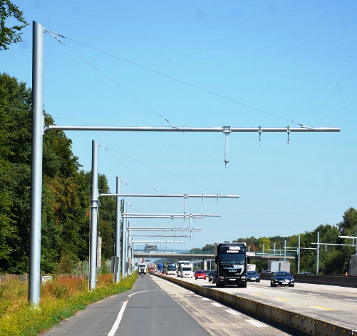 Bildunterschrift: E-Highway – Oberleitung für Hybrid-LKW auf der A5 bei Frankfurt/Main